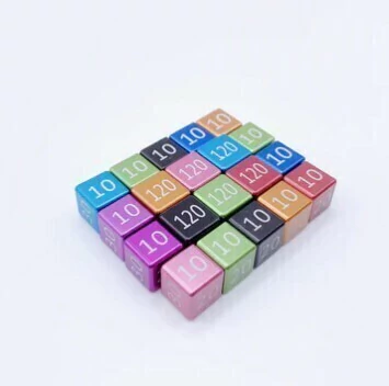 Cada conjunto contém quatro dados de 12 mm marcados de 10 a 60 e dois dados de 13 mm numerados de 70 a 120.